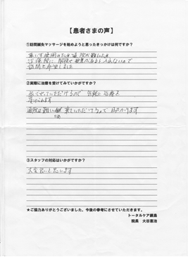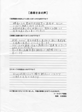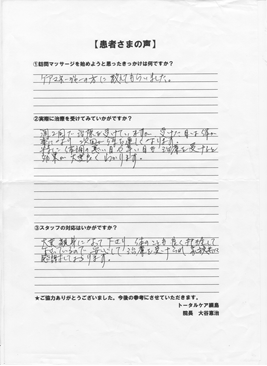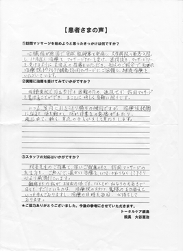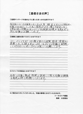 少しづつですが、治療を受けた結果、筋肉、関節が柔軟になった様な気がします。これからも治療を継続して行きたいと思いますので宜しくお願いします。