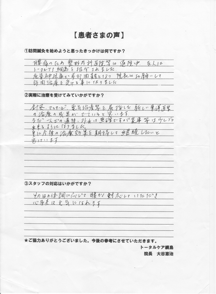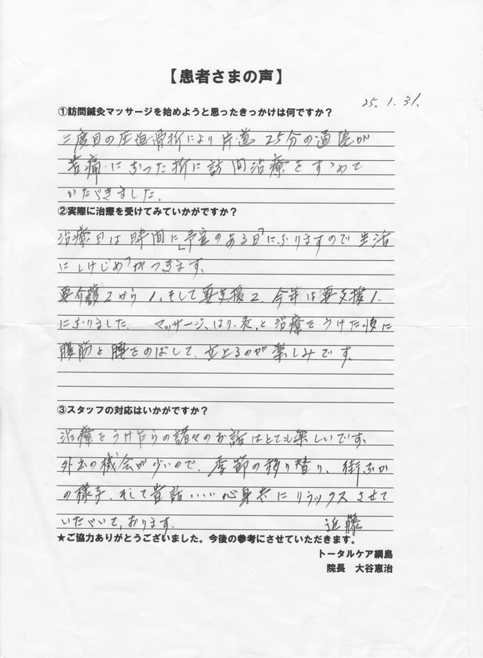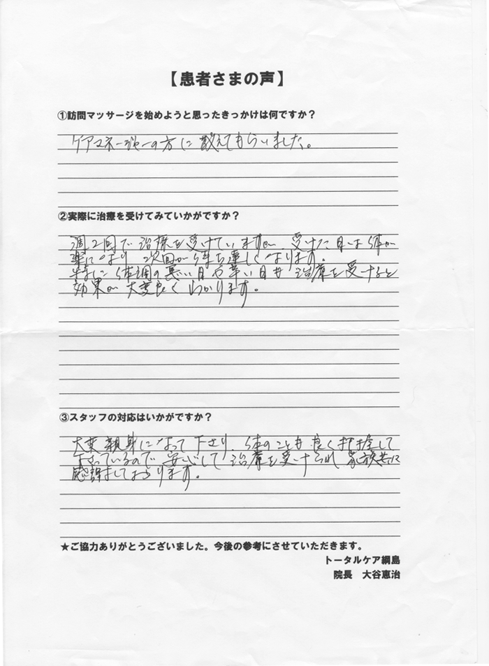 院長先生のご指導と、深いご配慮のもと、訪問マッサージの先生方も、ご熱心で温かい治療をいつもかわりなくして下さり心より感謝しています。難病もちの私が、不自由の体でも、何とか私なりの元気さで日々をすごしているのは、治療院のスタッフ、皆様のお力添えといつも考えておりますし、治療の日時を毎回心待ちしております。