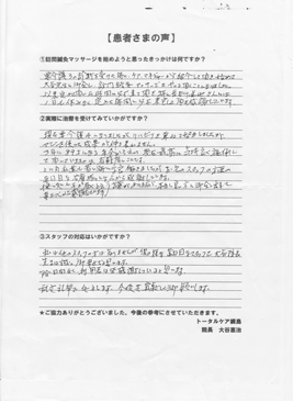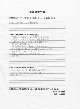 現在要介護4になりましたが、リハビリを兼ねて努力しましたが、マシンを使った成果が仲々表れません。3月に89才になる年令から云って、現在最高に気持ち良く施術して頂いていますのは有難度いことです。とに角私達も若い時には良働きましたが、お宅のスタッフの方達の真面目な治療振りには心から感謝しています。痒い処に手が届くと云う言葉がありますが、本当に良い方に御会い出来た事を心から感謝しています。