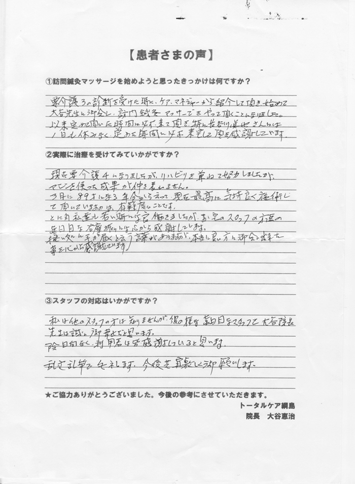 要介護3の診断を受けた時に、ケアマネージャーから紹介して頂き、始めて大谷先生と御会し、訪問鍼灸マッサージをやって頂くことになりました。 以来、定めて頂いた時間に必ず来て頂き、特に長谷川真也さんには1日も休みなく定めた時間に必ず来宅して頂き感謝しています。